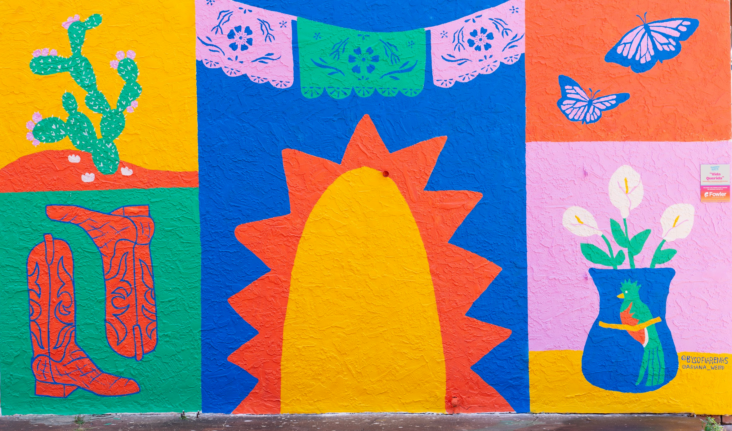 The mural, Vida Querida, is a celebration of life and the color we all have around us. Embracing heritages, stories, and people that surround the multicultural district. The sun is the center-point, where people are encouraged to step into and “complete” the mural by taking up space and embracing themselves.